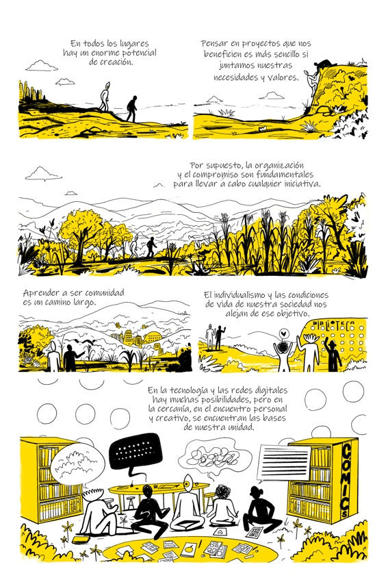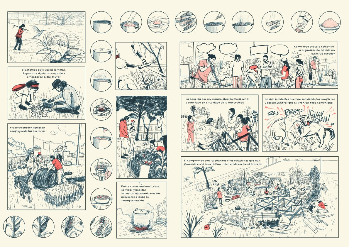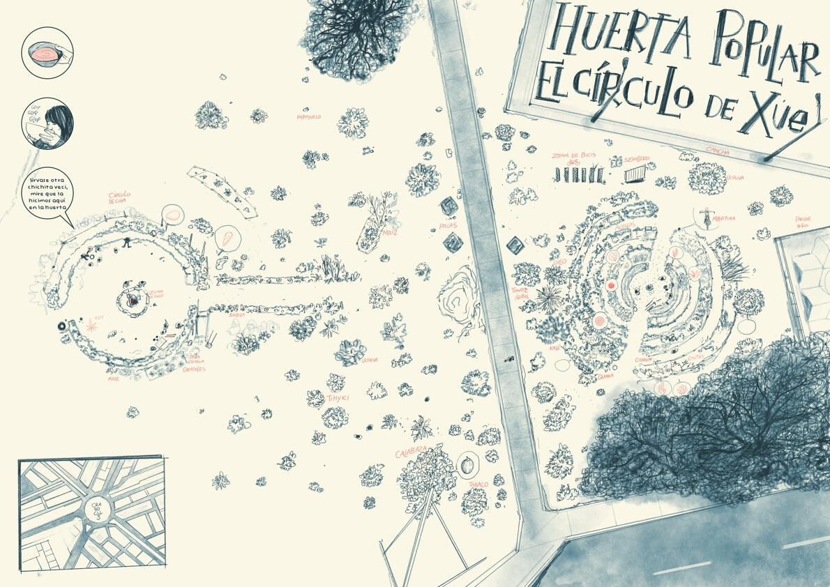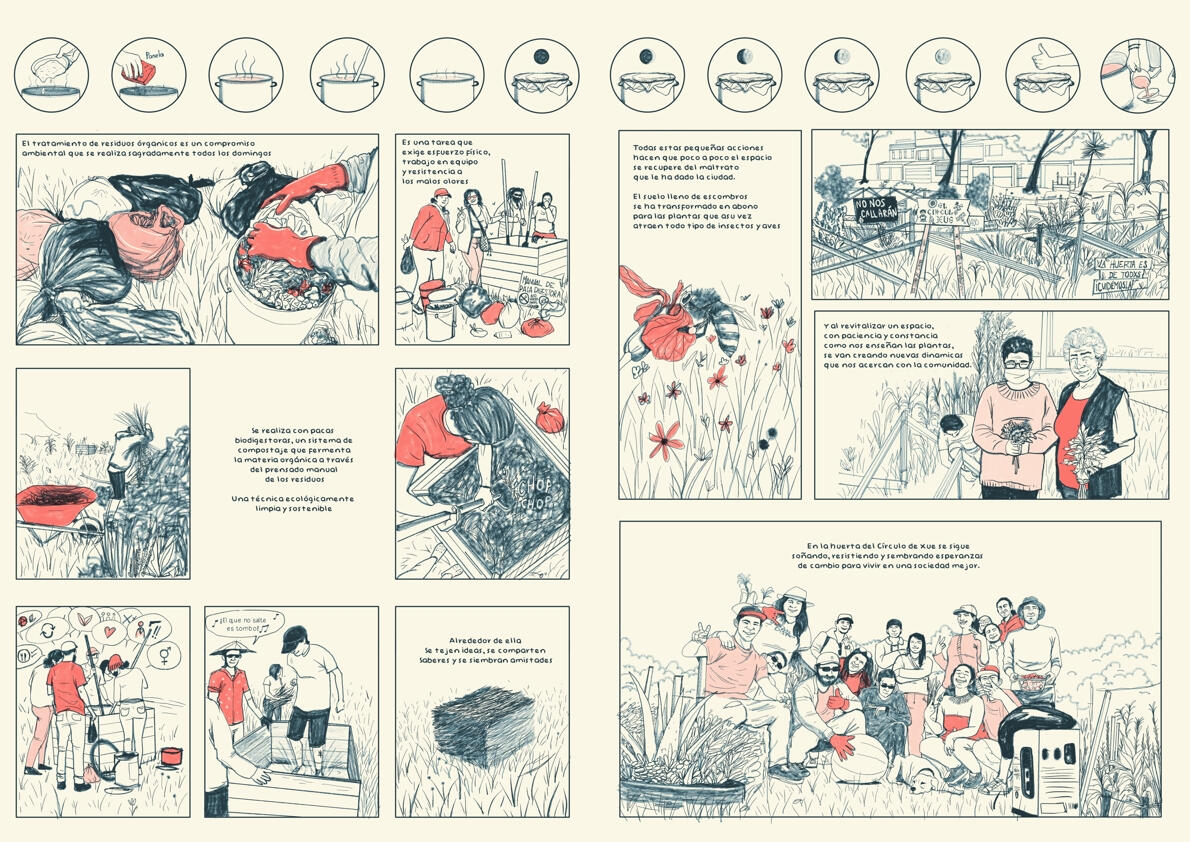 El Círculo de Xue es una huerta urbana que surgió como resultado de las asambleas populares que se llevaron a cabo en el contexto del estallido social en la localidad de Puente Aranda en 2021. Como artista y participante de este proceso comunitario, quise relatar a través de un cómic documental, la historia de lo que han sido estos años de esfuerzos colectivos, resistencia, organización y transformación del espacio público en medio de la ciudad.